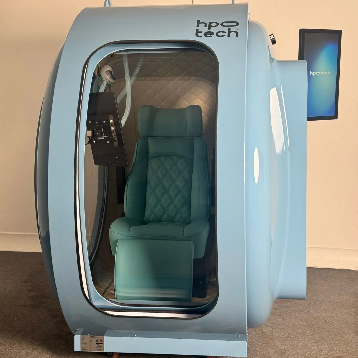 Vårt moderne trykkammer er designet med fokus på din trygghet og komfort. Den brede inngangen gjør det enkelt å stige ut og inn, og den ergonomiske stolen sørger for en avslappende opplevelse under hele behandlingen.